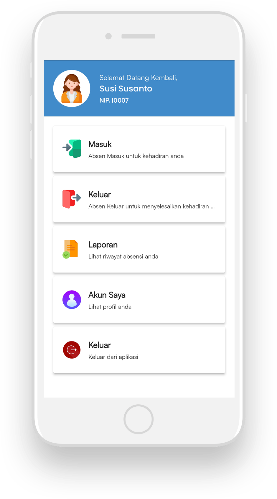 Anda dapat melihat data absen Anda. Pilih menu 'Laporan' untuk melihat data riwayat absensi yang sudah Anda masukkan sebelumnya.